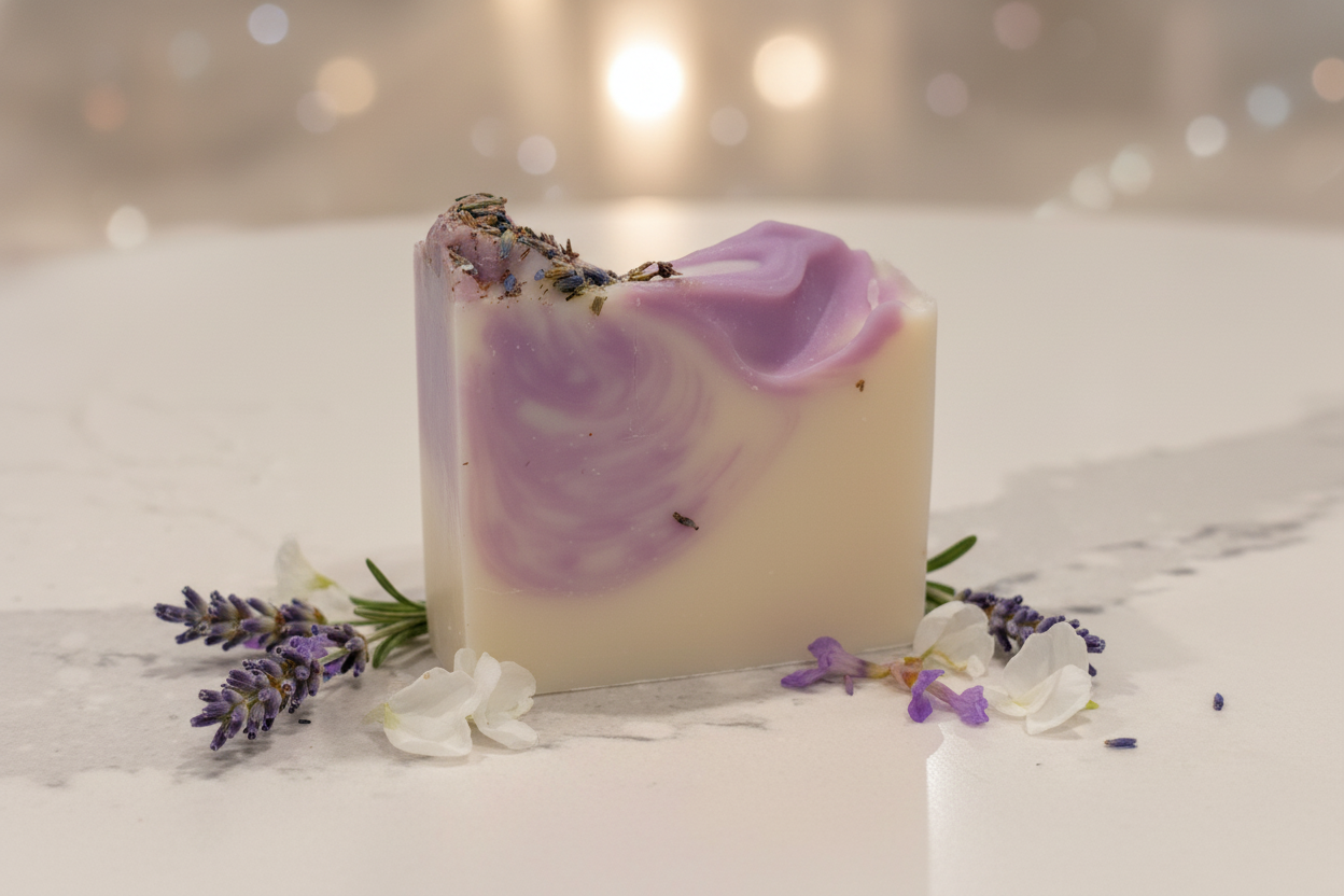 The soothing aroma of lavender gently encourages the nervous system to soften, while a nourishing blend of olive oil, coconut oil, and shea butter creates a rich, creamy lather that cleanses without stripping the skin. Finished with delicate lavender buds and soft violet swirls, each bar reflects the quiet fullness that comes from living in balance.