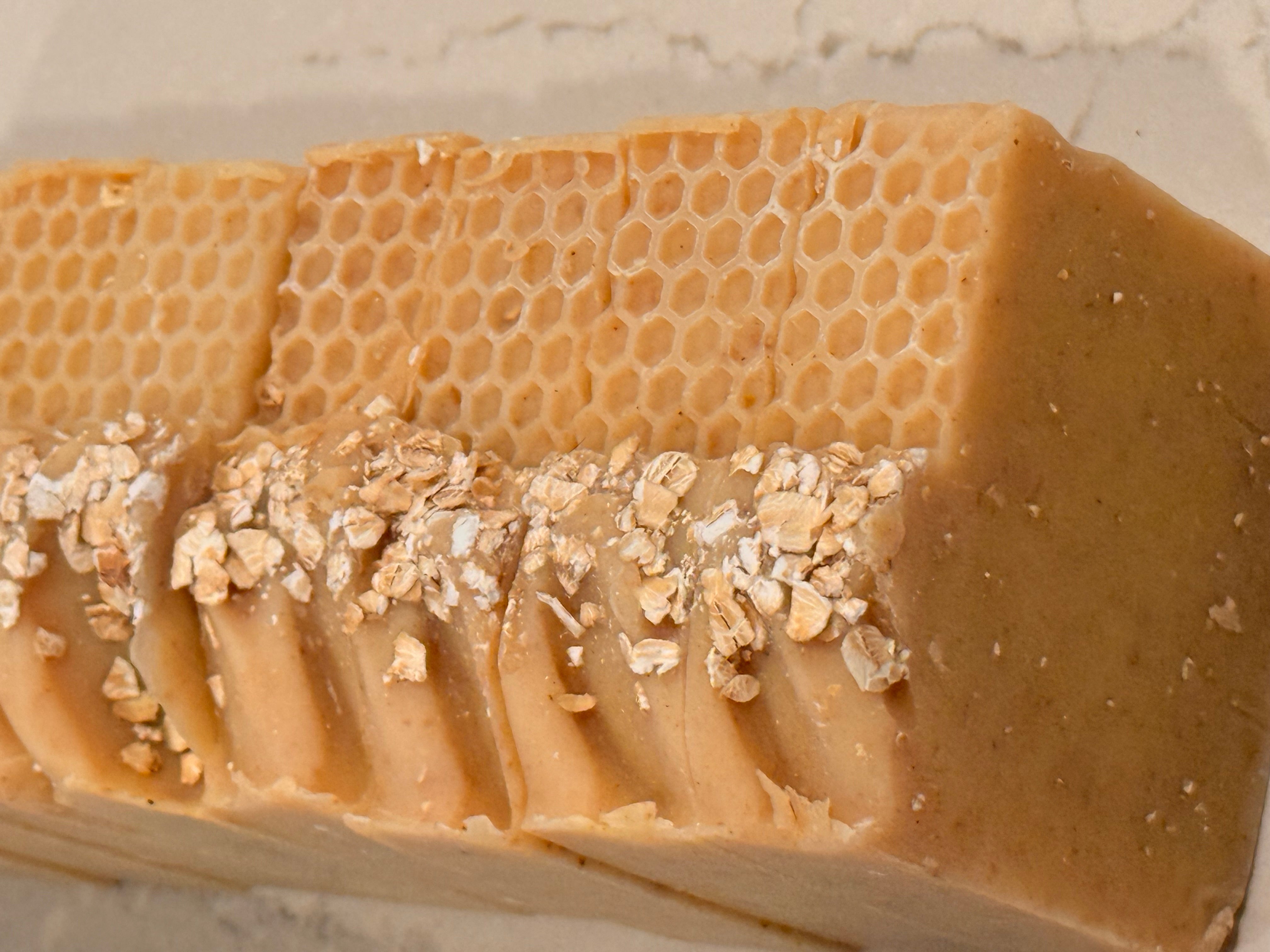 Olive Oil, Coconut Oil, Shea Butter, Water, Sodium Hydroxide, Castor Oil, Turmeric, Oatmeal, Honey, Fragrance Oil, Mica.