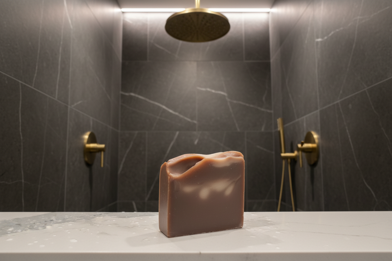 Formulated with a nourishing base of olive oil, coconut oil, and shea butter, this bar produces a rich, velvety lather that cleanses effectively without stripping moisture. Its warm, neutral tones and smooth swirls reflect the quiet strength and stability this ritual is meant to support.