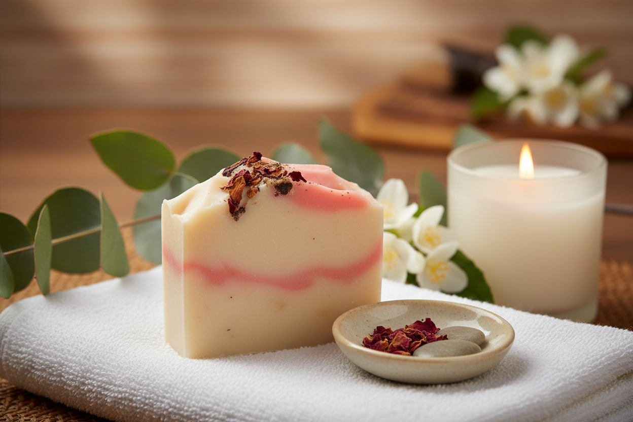 This handcrafted artisan soap features soft blush and creamy ivory tones, delicately finished with real rose petals. Its light, calming floral fragrance is clean and subtle, designed to soothe the senses rather than overwhelm them, creating space for presence, ease, and quiet renewal.